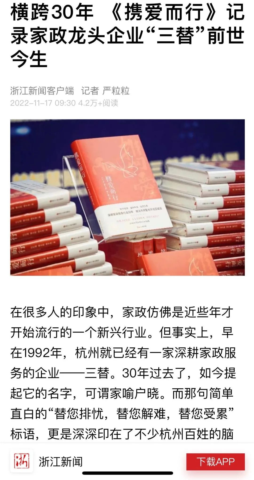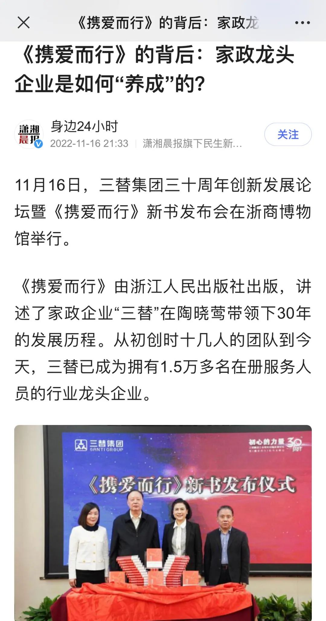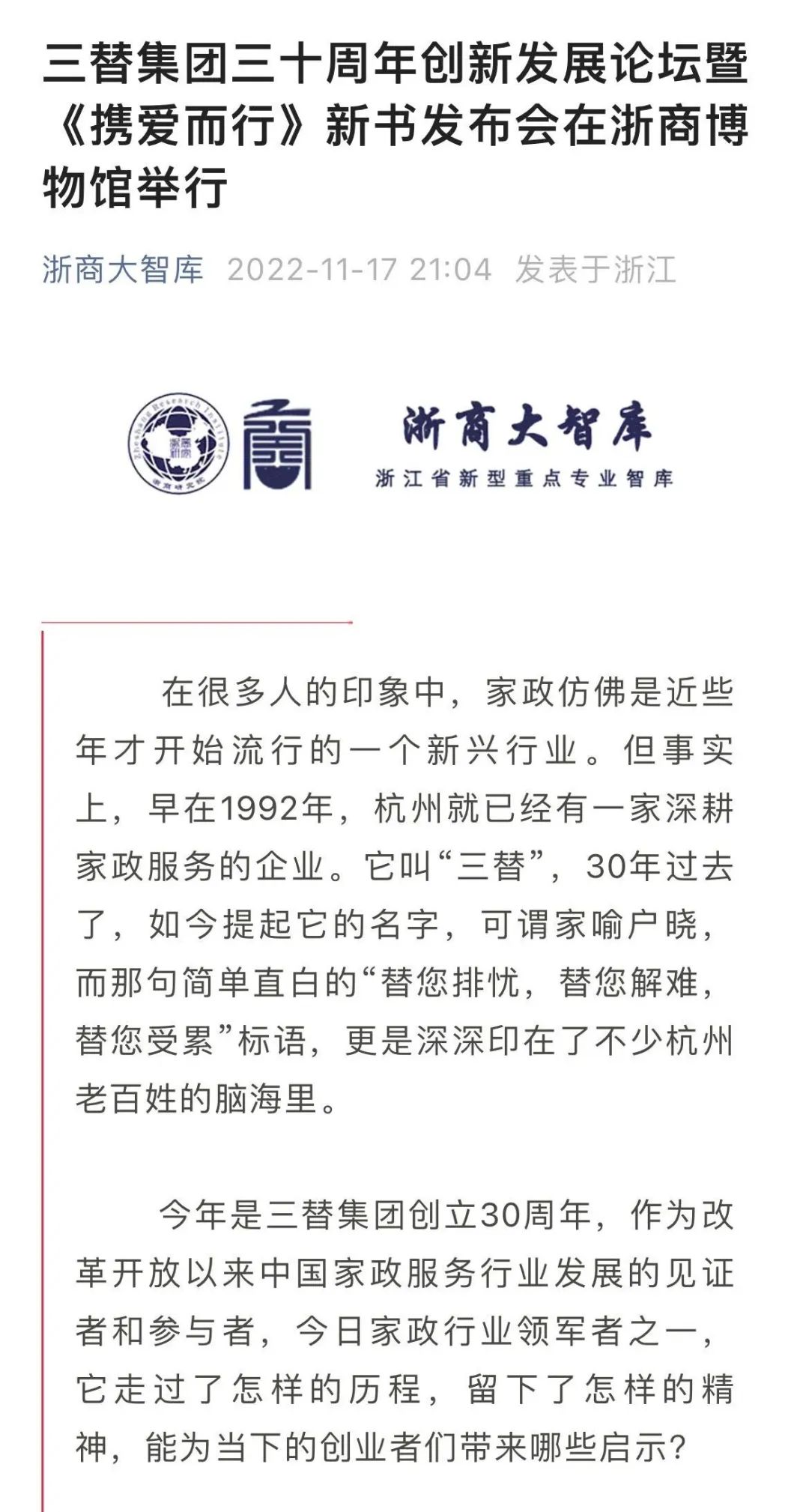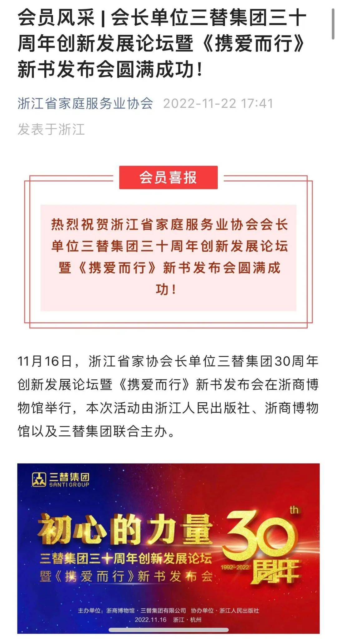 浙江省家庭服務業協會發布文章——會員風采 | 會長單位三替集團三十周年創新發展論壇暨《攜愛而行》新書發布會圓滿成功!作為浙江省家庭服務業協會的會長單位,三替成功舉辦本次發展論壇暨新書發布意義重大。表明了要堅定不移走在行業前沿、不斷超越自我的決心。