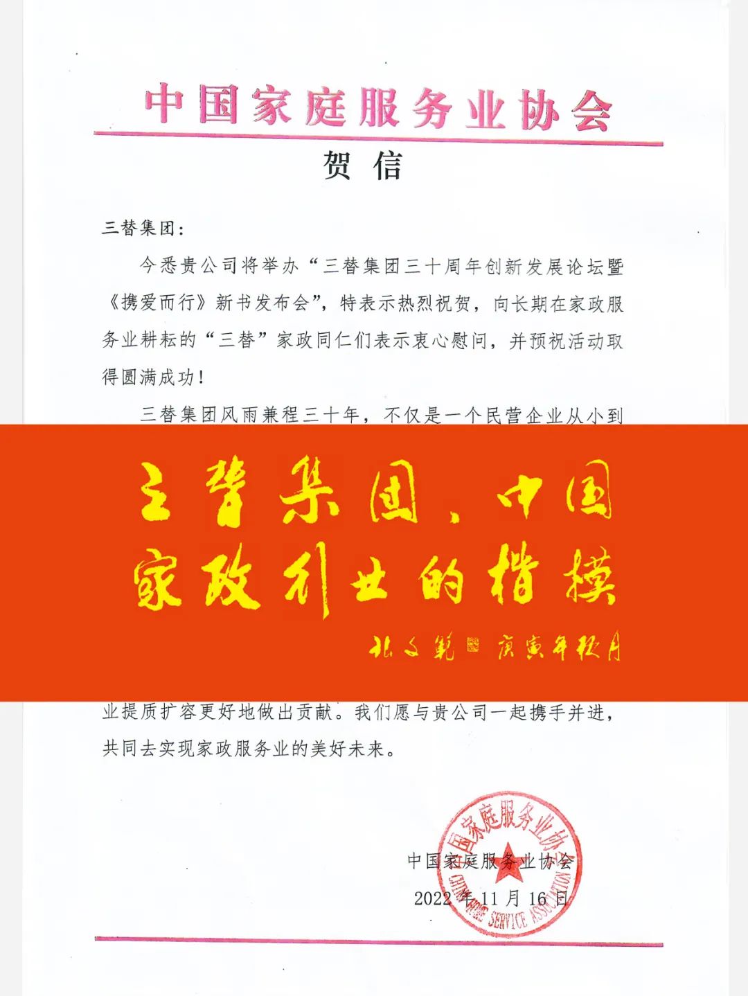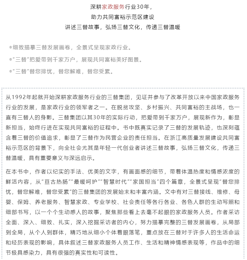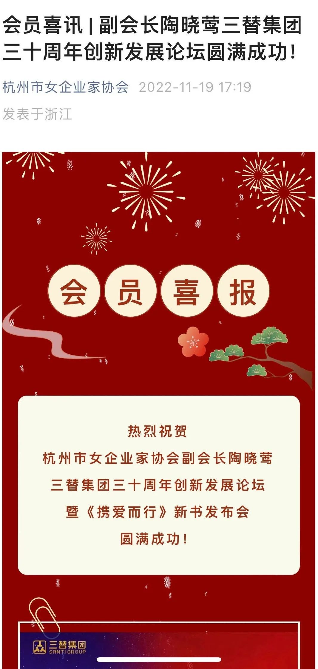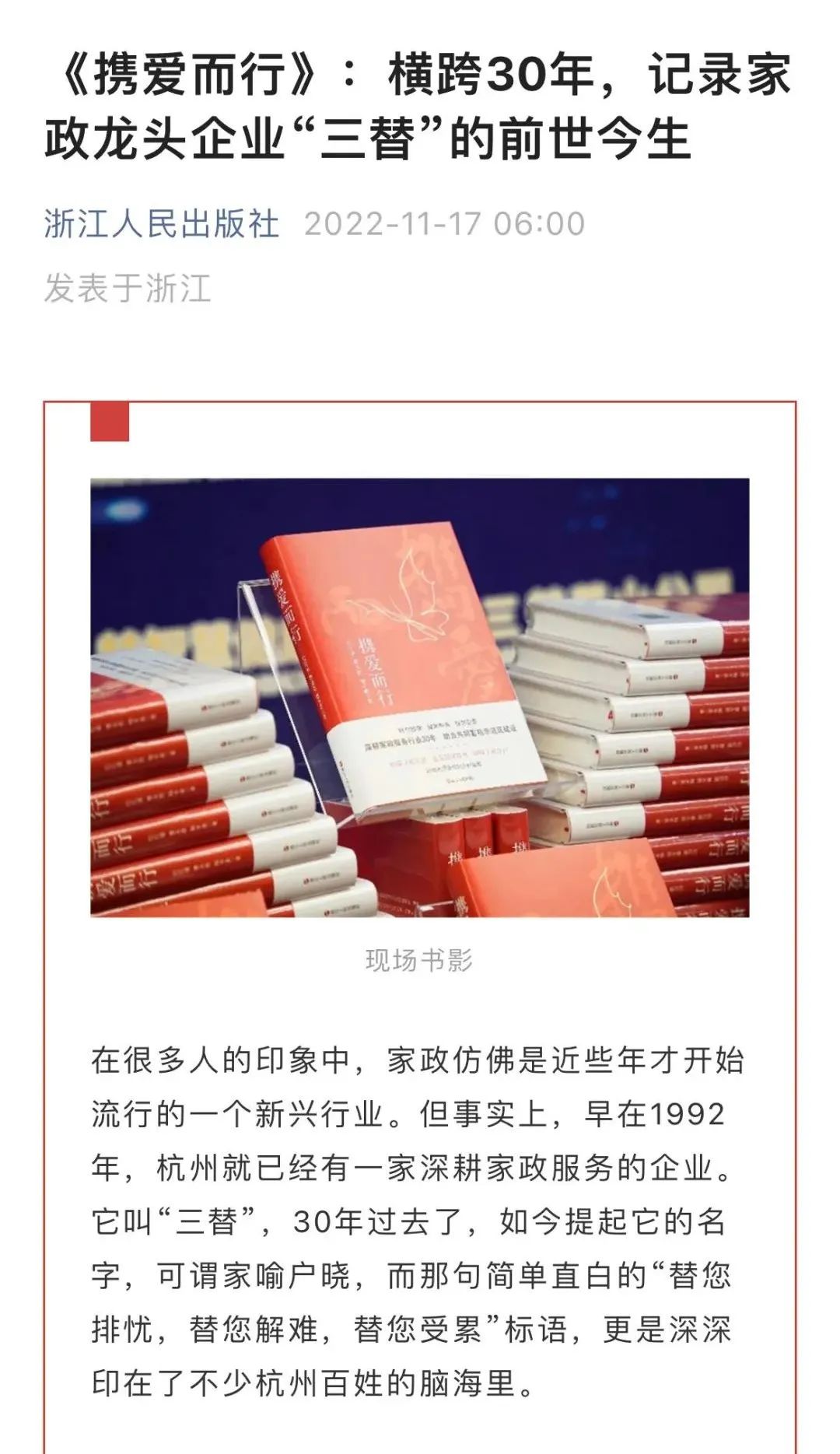 浙江省家庭服務業協會發布文章——會員風采 | 會長單位三替集團三十周年創新發展論壇暨《攜愛而行》新書發布會圓滿成功!作為浙江省家庭服務業協會的會長單位,三替成功舉辦本次發展論壇暨新書發布意義重大。表明了要堅定不移走在行業前沿、不斷超越自我的決心。