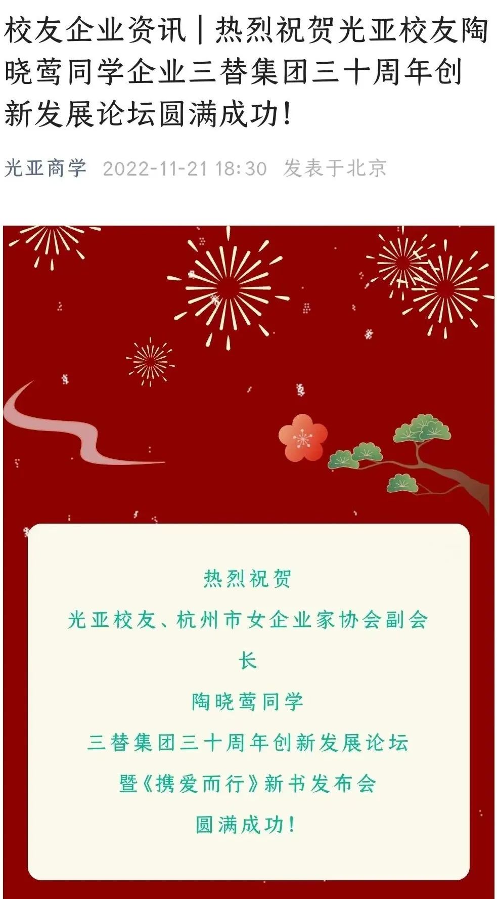 光亞裔學發布文章——校友企業資訊 | 熱烈祝賀光亞校友陶曉鶯同學企業三替集團三十周年創新發展論壇圓滿成功!