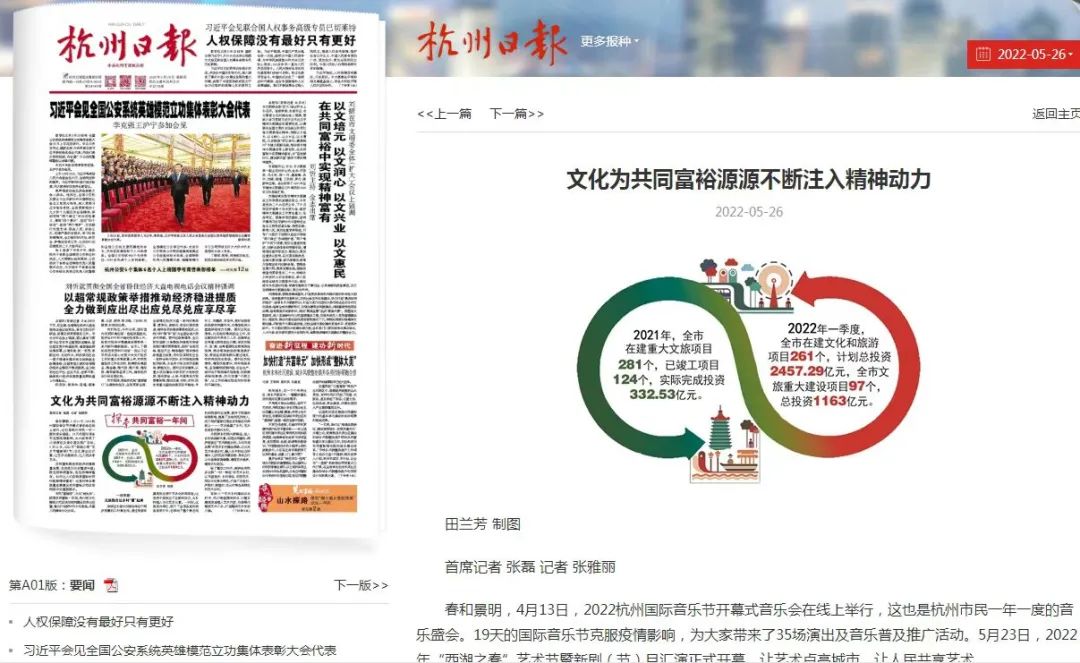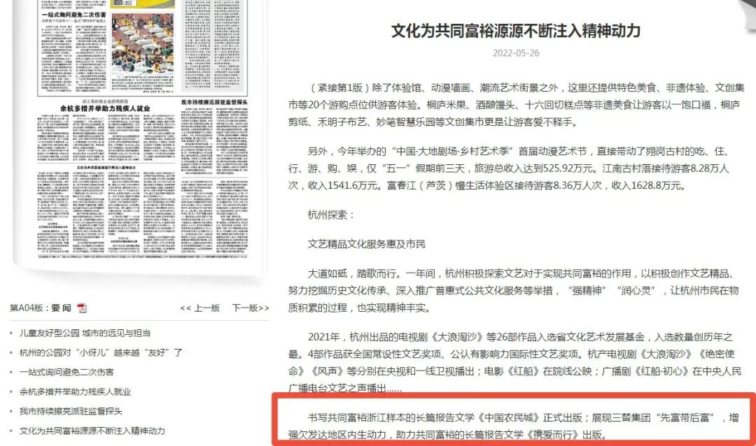 杭州日報頭版專欄撰文——文化為共同富裕源源不斷注入精神動力。文章中強調“增強欠發達地區內生動力,助力共同富裕的長篇報告文學《攜愛而行》出版。”文學為實現共同富裕發揮了“強精神”、“潤心靈”的作用。