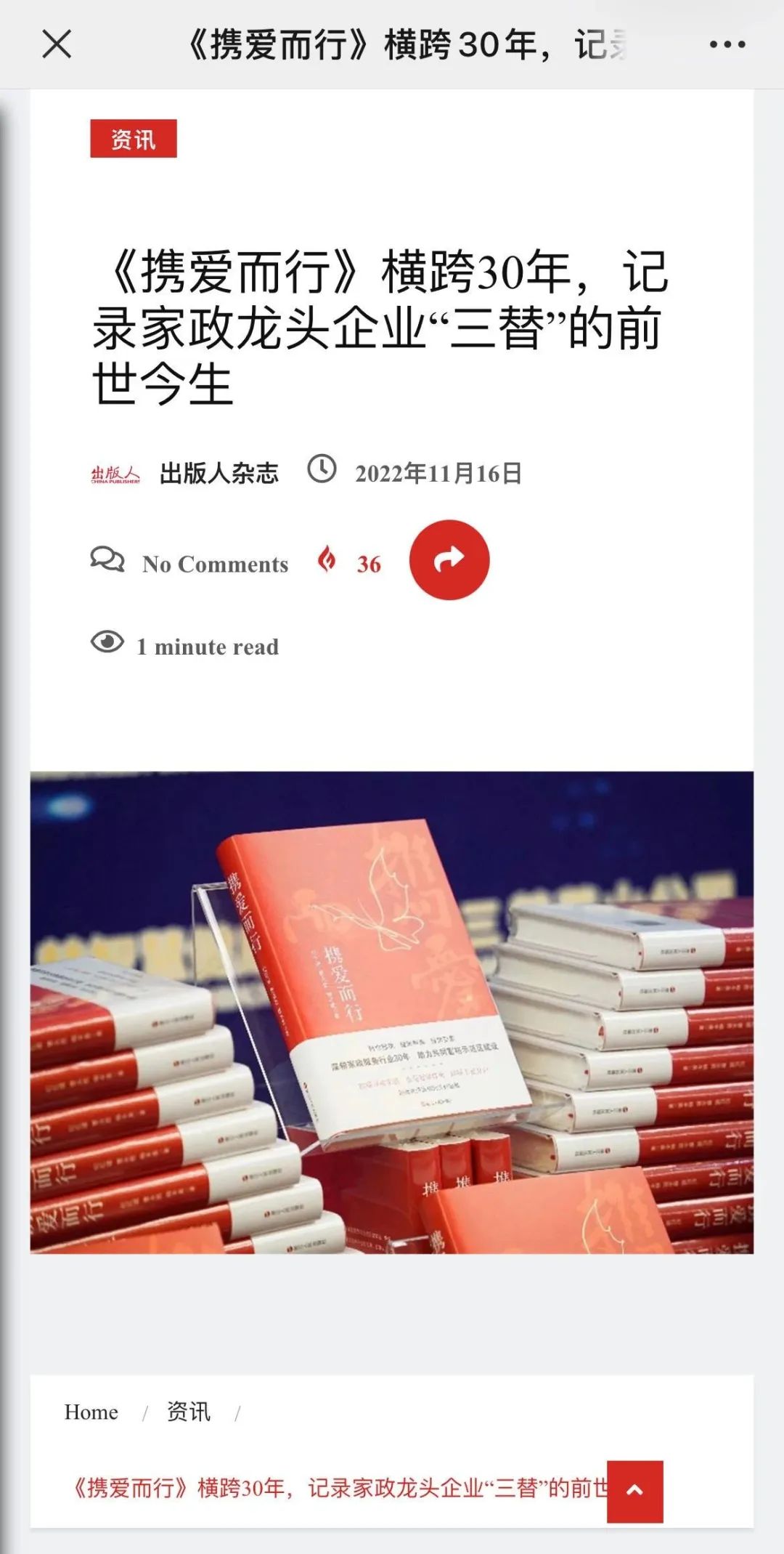 出版人雜志發布文章——《攜愛而行》橫跨30年,記錄家政龍頭企業“三替”的前世今生。作為深耕圖書出版領域的頭部媒體,本次《攜愛而行》新書發布會也吸引了出版人雜志的關注。