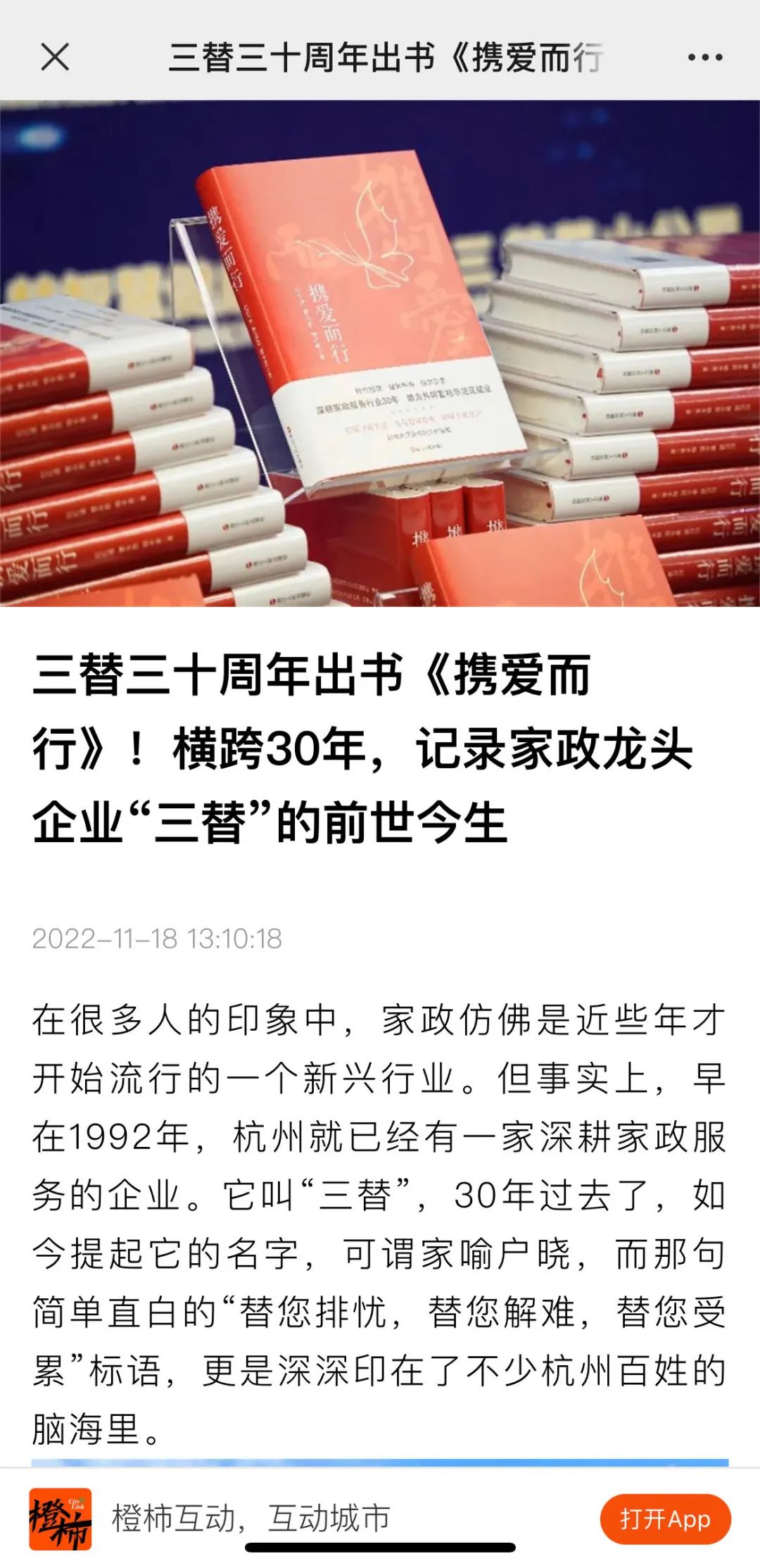 都市快報“橙柿互動”欄目發表文章——三替三十周年出書《攜愛而行》!橫跨30年,記錄家政龍頭企業“三替”的前世今生。橙柿互動APP是新型城市主流融媒平臺,對三替三十周年創新發展論壇暨《攜愛而行》新書發布會進行了跟蹤報道。