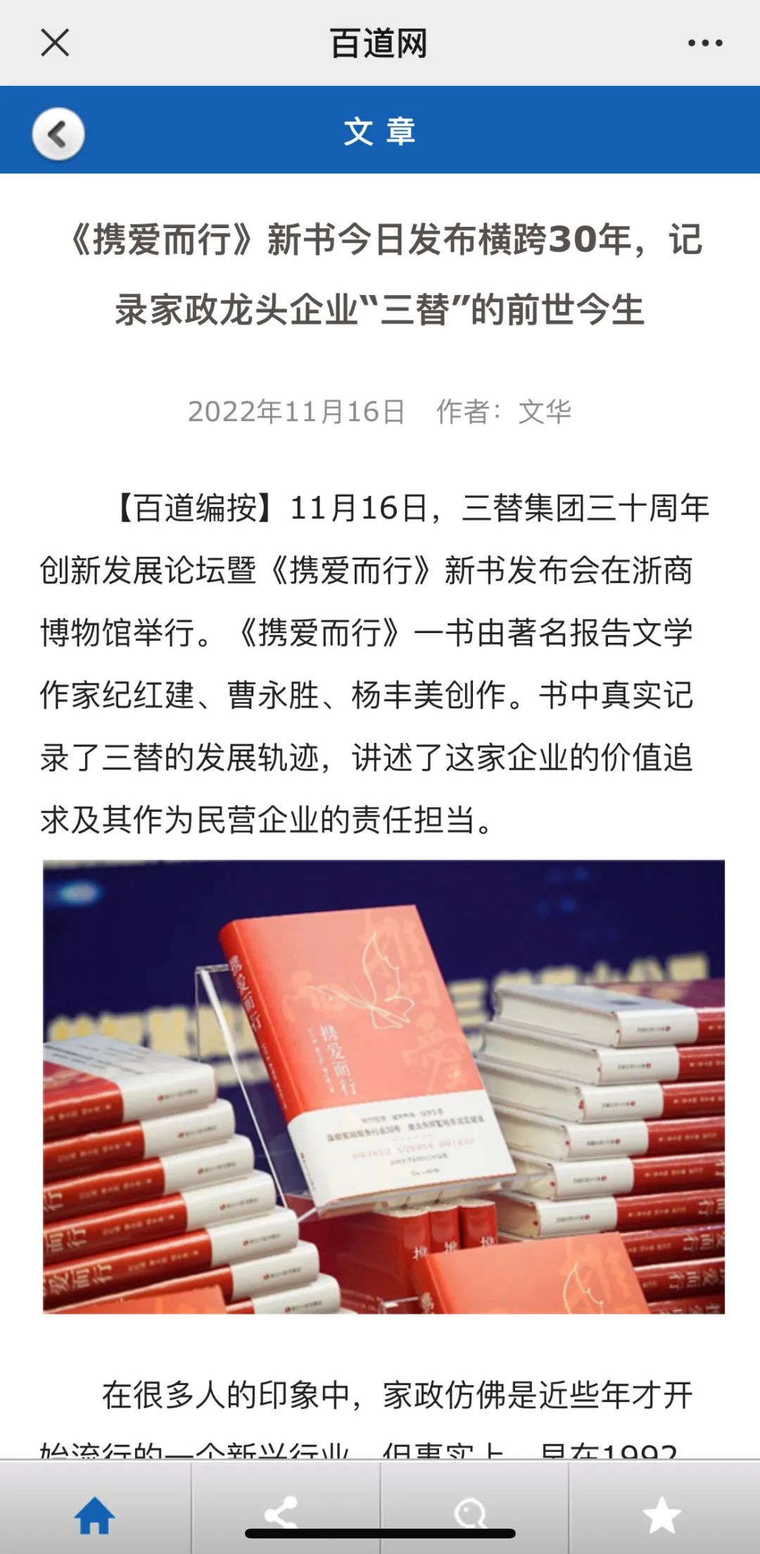 百道網發布文章——《攜愛而行》新書今日發布橫跨30年,記錄家政龍頭企業“三替”的前世今生。百道網是書業與閱讀產業的門戶網站,針對此次新書發布也進行了聚焦報道。