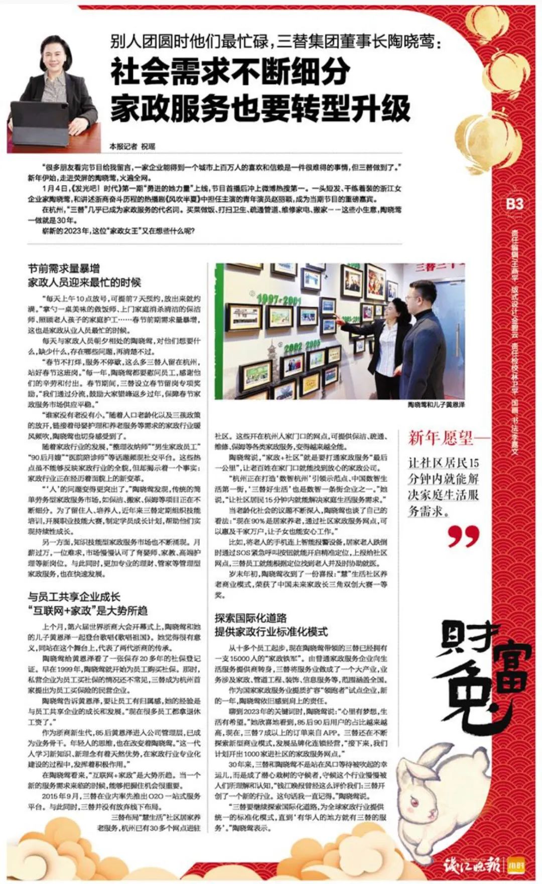 聊到2023年的關鍵詞時,陶曉鶯說:“心里有夢想,生活有希望。”她欣喜地看到,85后90后用戶的占比越來越高,現在,三替7成以上的訂單來自APP。三替還在不斷探索新型商業模式,發展品牌化連鎖經營,“接下來,我們計劃開出1000家進社區的家政服務網點。”