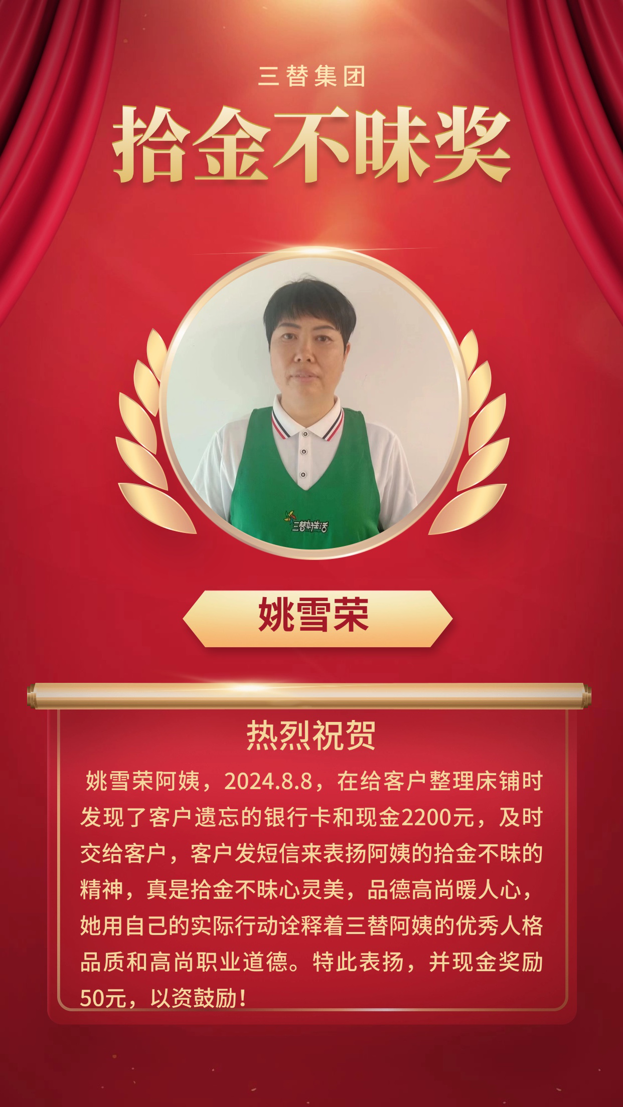 為表彰姚雪榮阿姨這一難能可貴的品質,三替集團決定通報表揚,并頒發現金獎勵。這不僅是對她職業道德和個人品德的肯定與鼓勵,更是對三替精神的一種傳承與弘揚。
