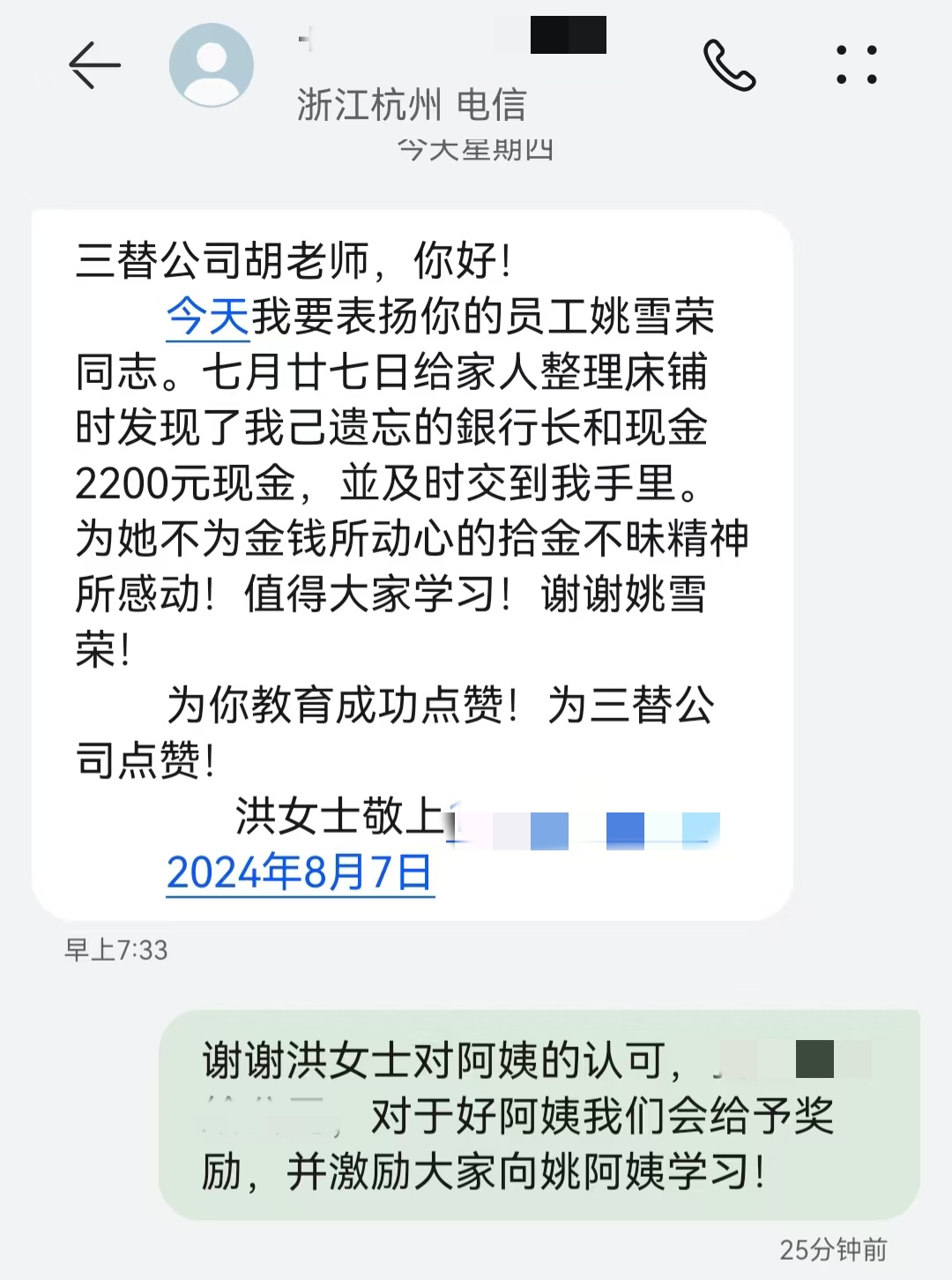 客戶被姚阿姨的真誠和善良所打動,也十分滿意她的日常工作,于是主動發短信給公司表揚姚阿姨:“為姚阿姨拾金不昧的精神所感動......為她點贊!為三替點贊!”